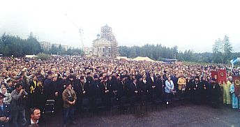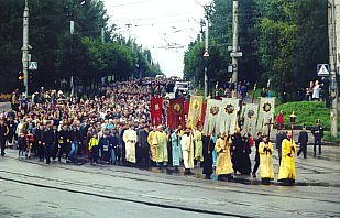 После Божественной литургии, совершенной митрополитом Кириллом, в которой приняло участие все духовенство епархии, крестный ход направился из Успенского кафедрального собора через весь город в новый микрорайон, где высится теперь храм новомучеников и исповедников Российских. Площадь перед храмом стала центром торжества.