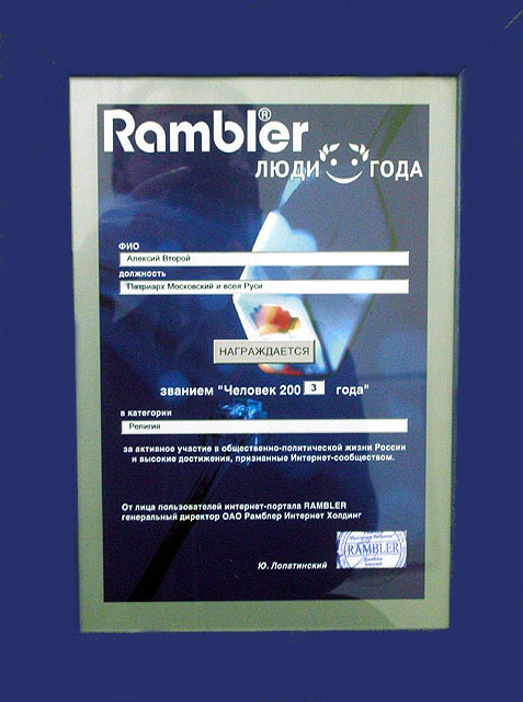 В наступившем 2004 году Его Святейшество получил официальный диплом «Человека 2003 года», выдаваемый от имени пользователей портала «Rambler» «за активное участие в общественно-политической жизни России и высокие достижения, признанные интернет-сообществом».