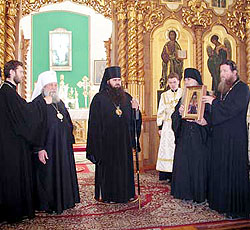 В знак благословения Дивеевской обители Владыка Георгий передал дар делегации Русской Зарубежной Церкви образ преподобного Серафима Саровского с частицей мощей угодника Божия.
