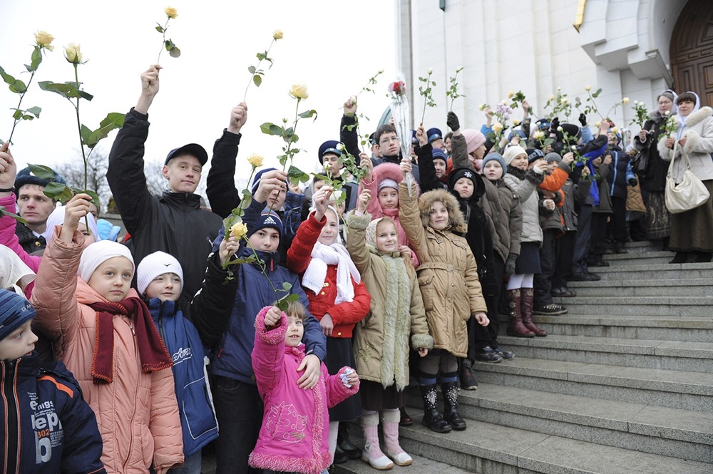 В храме и вокруг него собрались тысячи калининградцев, в том числе сотни детей.