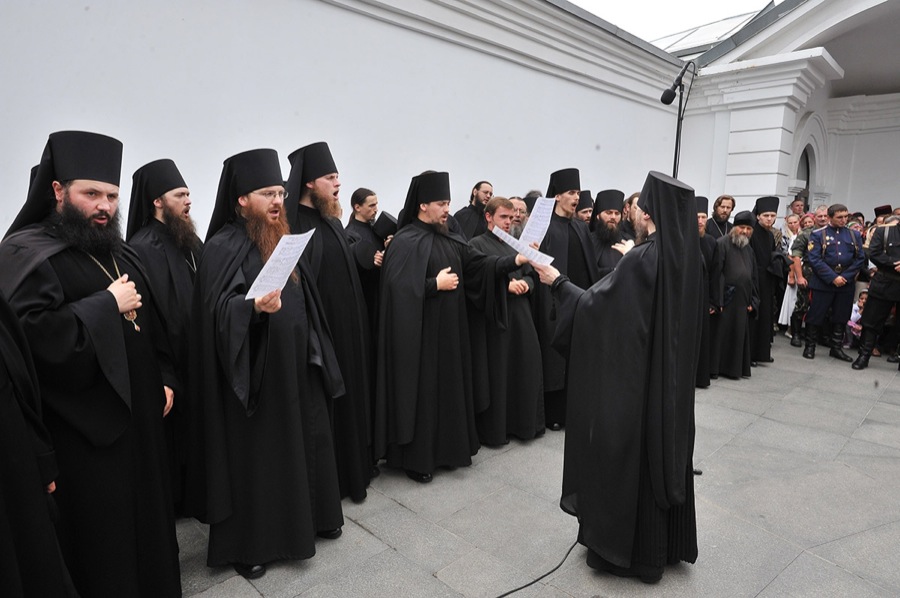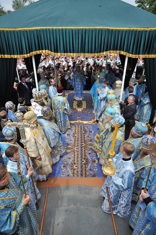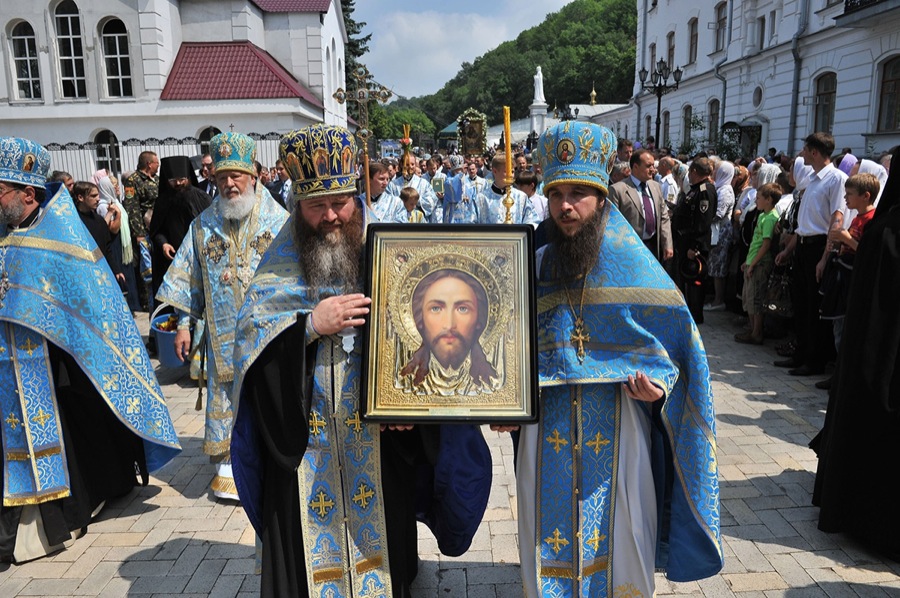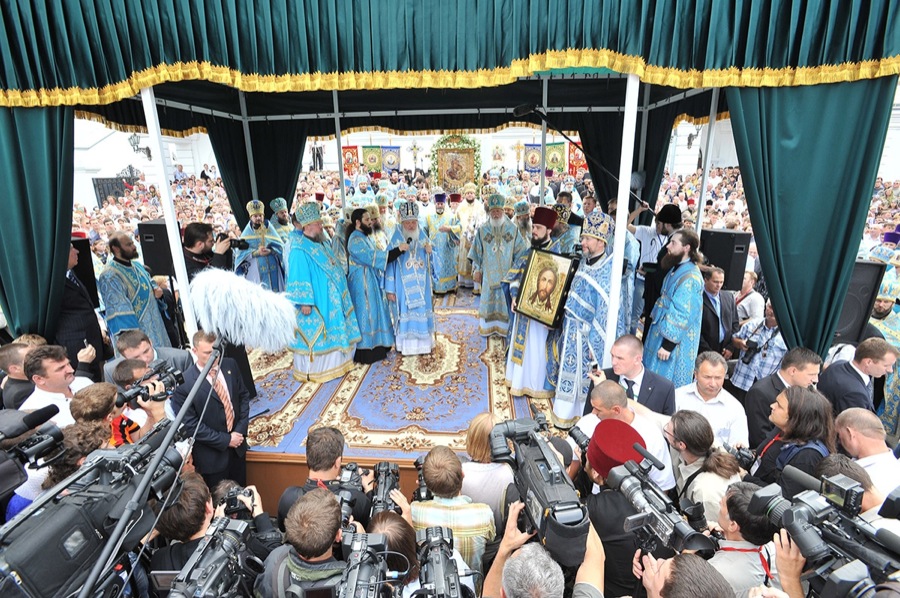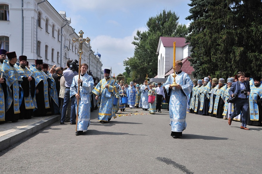 По завершении богослужения состоялся многотысячный крестный ход в преднесении главной святыни обители — Святогорской иконы Пресвятой Богородицы. Его Святейшество совершил на площади Лавры молебен.