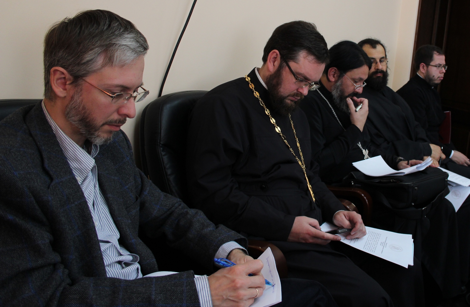 В заседании участвовали члены Ученого совета: проректор по научной работе протоиерей Владимир Шмалий, проректор по учебной работе иеромонах Иоанн (Копейкин), секретарь совета А.И. Мраморнов, заведующие кафедрами: библеистики М.Г. Селезнев, богословия А.Р. Фокин, древних и новых языков иеромонах Иоанн (Гуайта), общественных наук С.Л. Кравец, церковно-практических наук иерей Михаил Желтов, церковных искусств и археологии протоиерей Стефан Ванеян, философии В.Н. Катасонов, а также заместитель заведующего кафедрой внешних церковных связей протоиерей Сергий Звонарев.