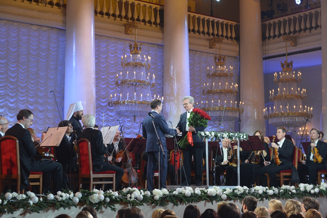 Его Святейшество упомянул труды юбиляра по сохранению лучших традиций отечественного исполнительского мастерства и популяризации мировой музыкальной классики, педагогическую и просветительскую работу, поддержку молодых исполнителей. «Особо признателен Вам за труды в Патриаршем совете по культуре, членом которого Вы являетесь с момента его создания, а также за обширную благотворительную деятельность», – подчеркнул Святейший Владыка.